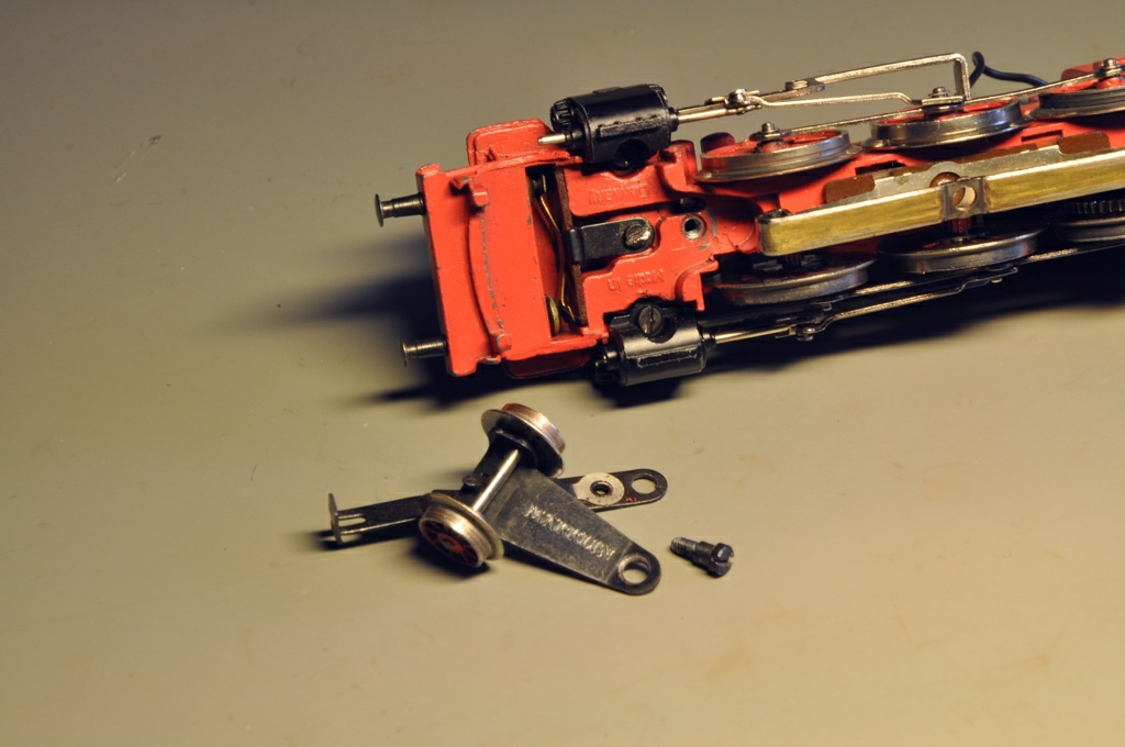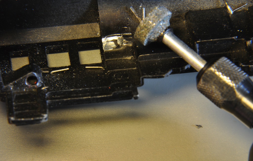 Die Lok wurde mit einem Rauchsatz nachgerüstet. Damit die Kabel nicht geknickt werden, wurde vom Chassis ein Teil abgeflext. Dazu die Lok komplett abkleben, damit kein Schleifstaub ins Fahrwerk gelangt (Tesa Krepp).