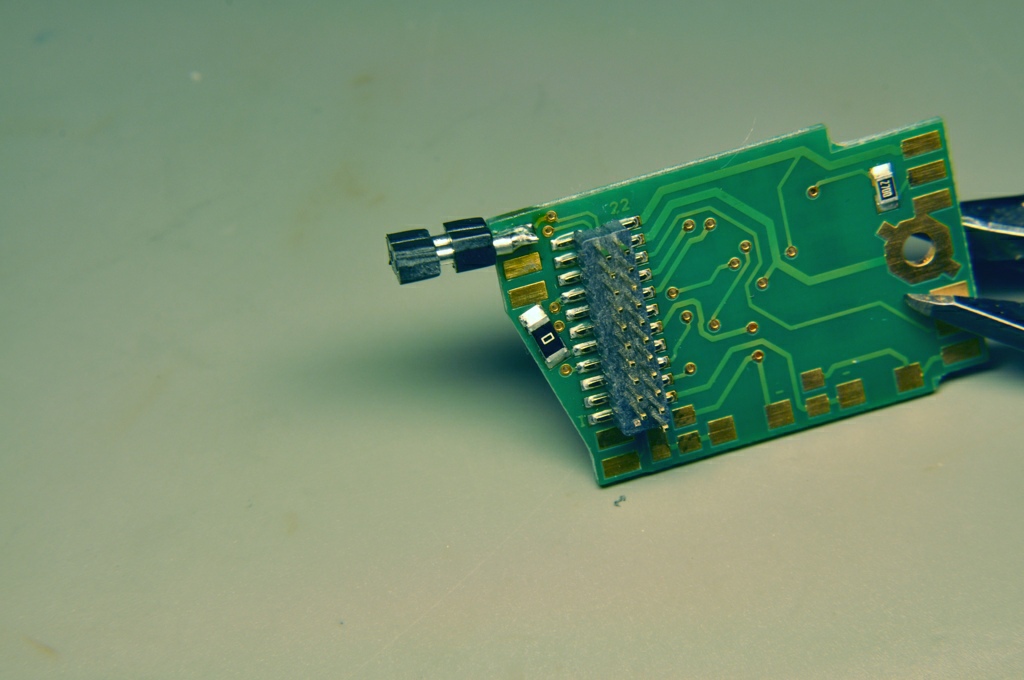 Ein Paar dient als Buchse, ein Paar als Stecker. Beim Auflöten schon zusammenstecken, damit der Stecker sich nicht verzieht. Vorteilhaft: auf der einen Seite der Ausgang Aux1, auf der anderen Decoder+.